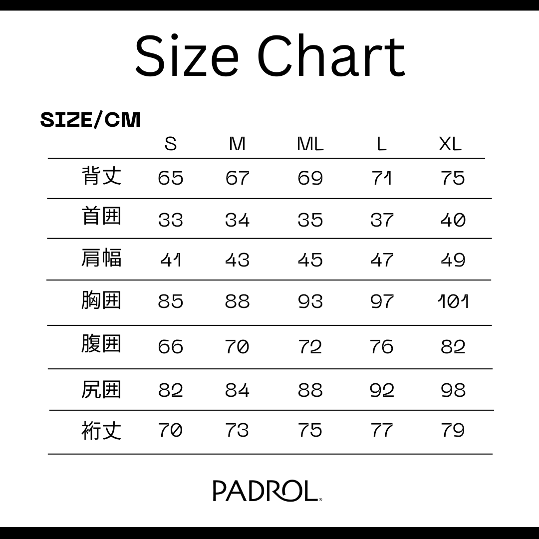 Size/cm S M ML L XL 背丈 65 67 69 71 75 首囲 33 34 35 37 40 肩幅 41 43 45 47 49 胸囲 85 88 93 97 101 腹囲 66 70 72 76 82 尻囲 82 84 88 92 98 裄丈 70 73 75 77 79