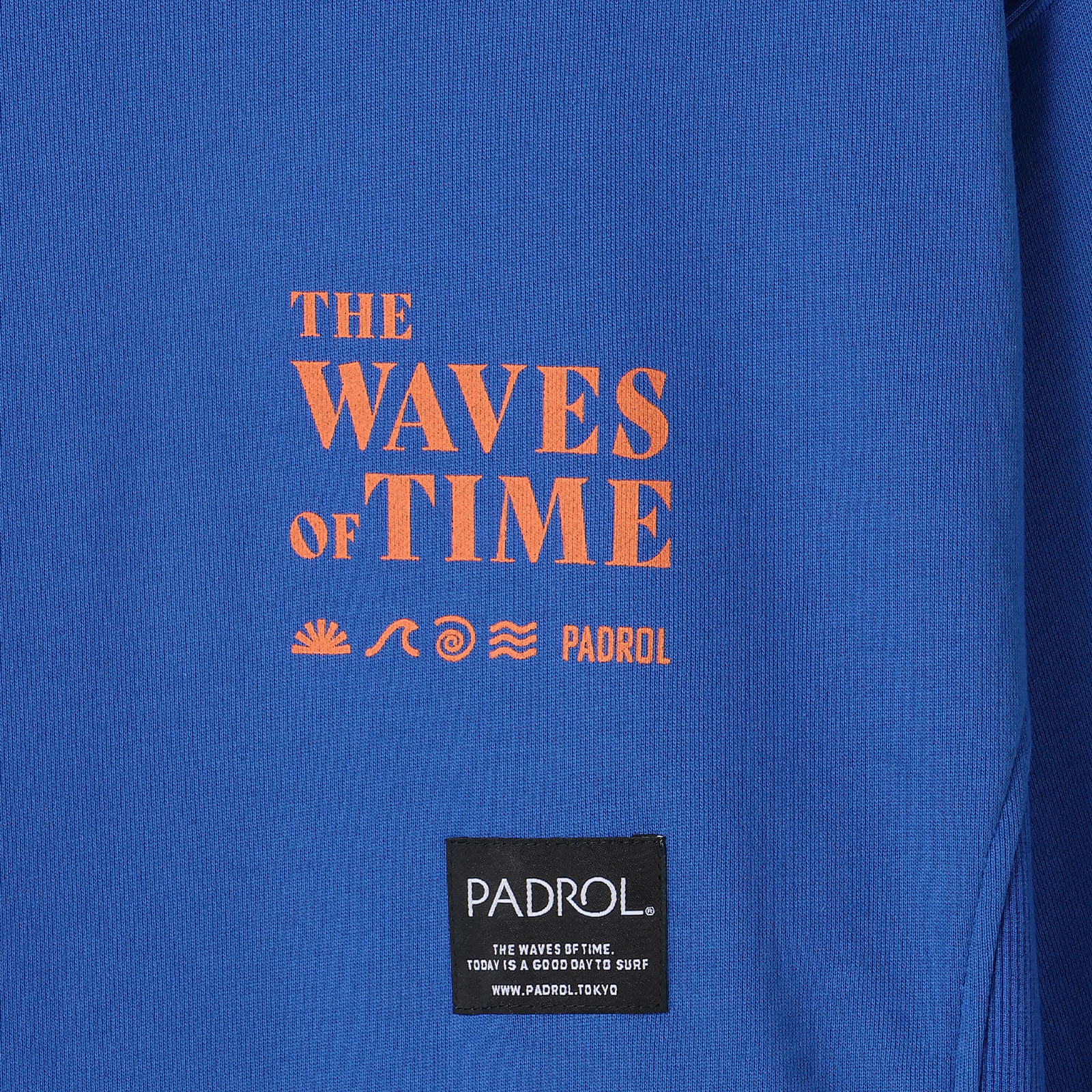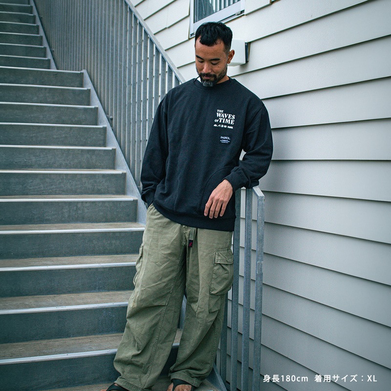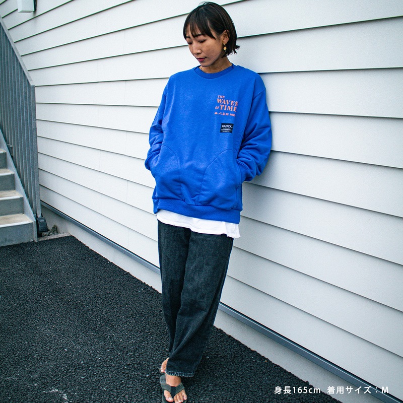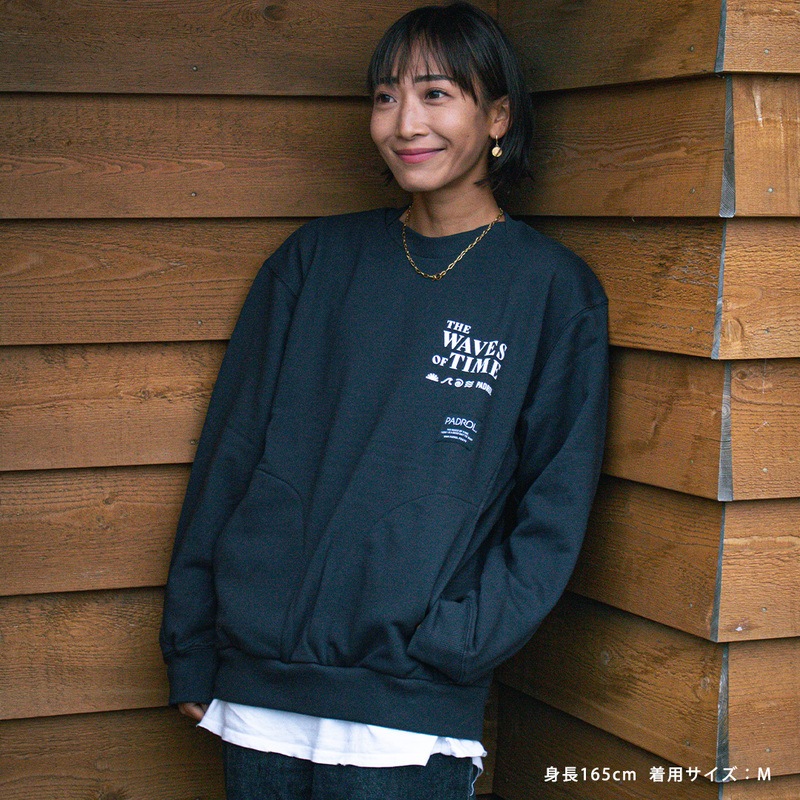 左胸のプリントは「THE WAVES OF TIME」「太陽と潮」をモチーフに、静かな時間の流れや海辺の情景をイメージしたデザイン。
