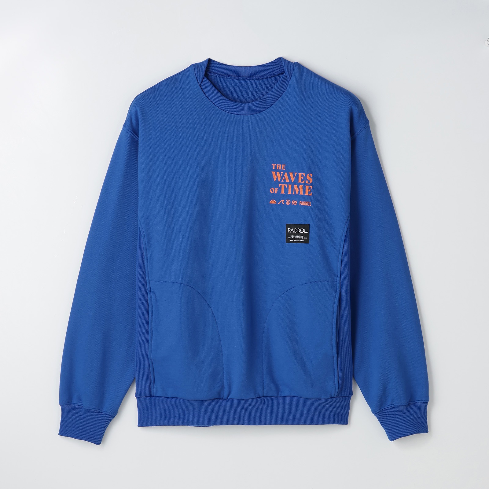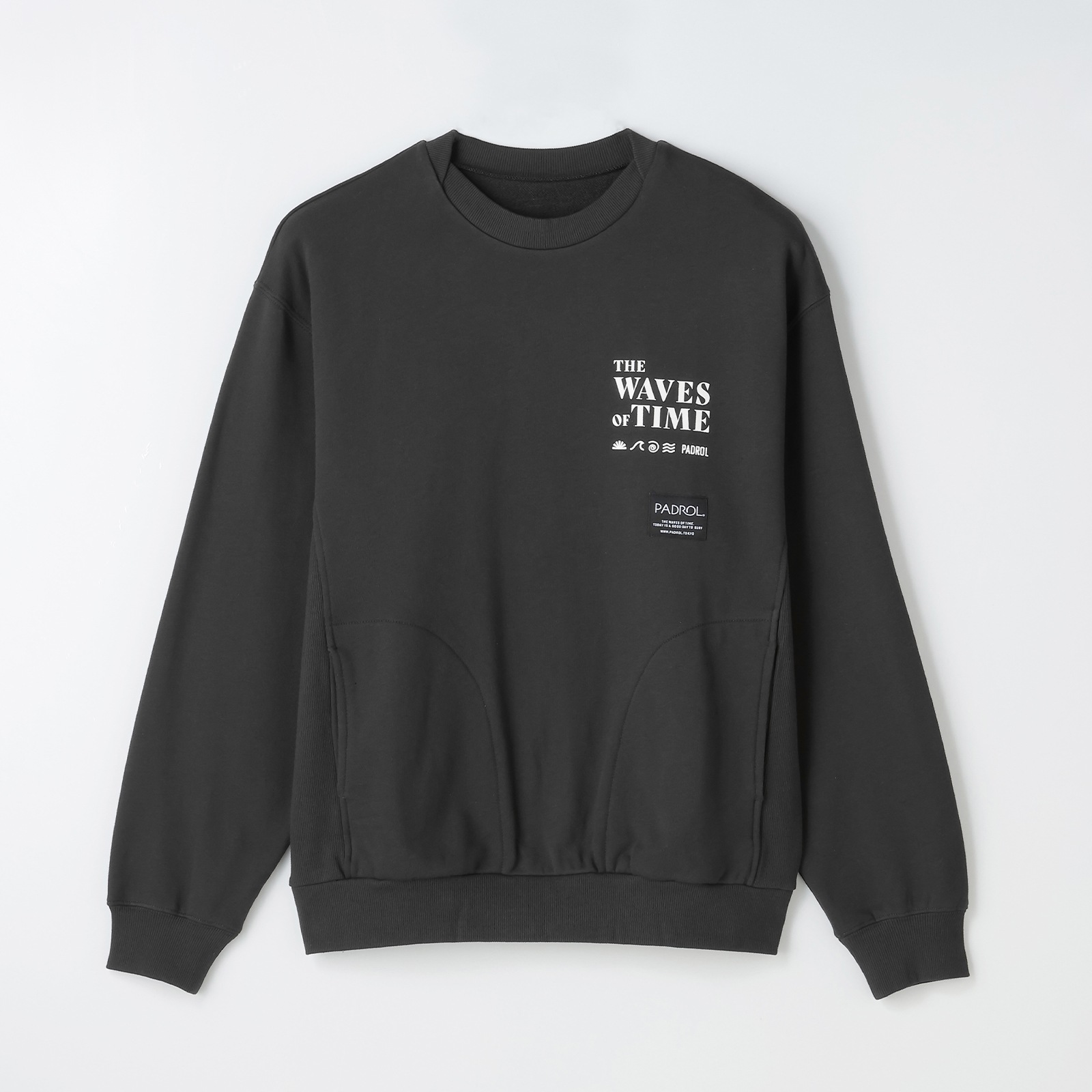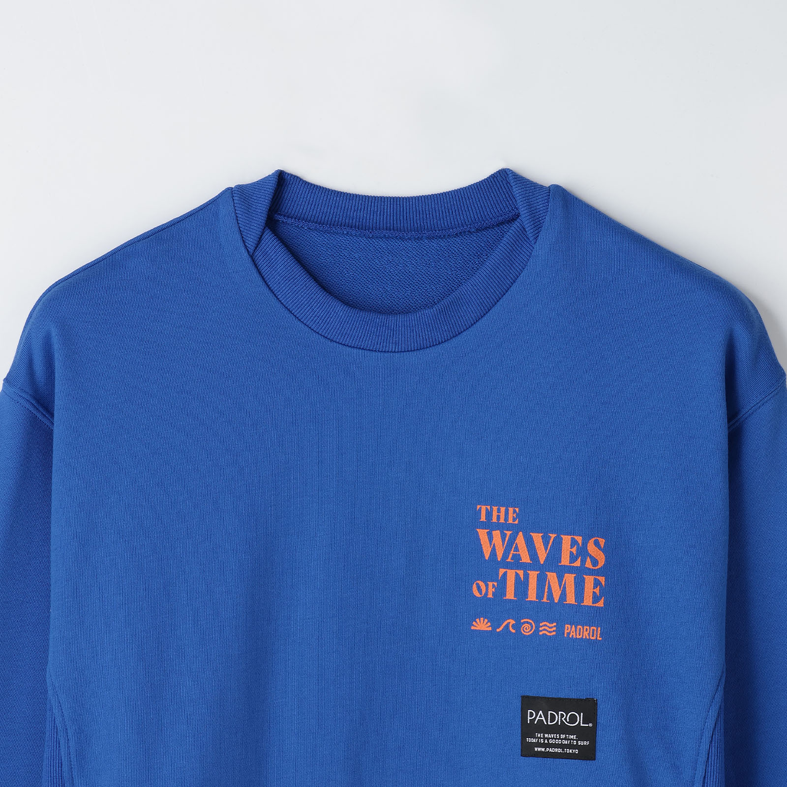 左胸のプリントは「THE WAVES OF TIME」「太陽と潮」をモチーフに、静かな時間の流れや海辺の情景をイメージしたデザイン。