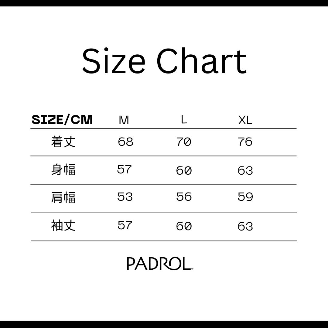 Size/cm M L XL 着丈 68 70 76 身幅 57 60 63 肩幅 53 56 59 袖丈 57 60 63 - 原産国