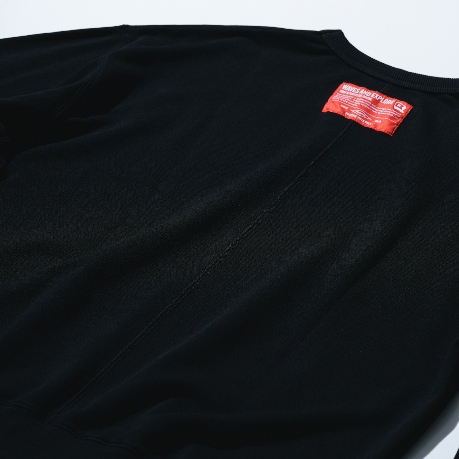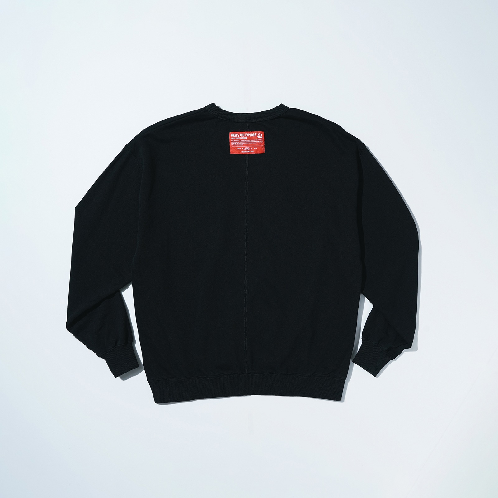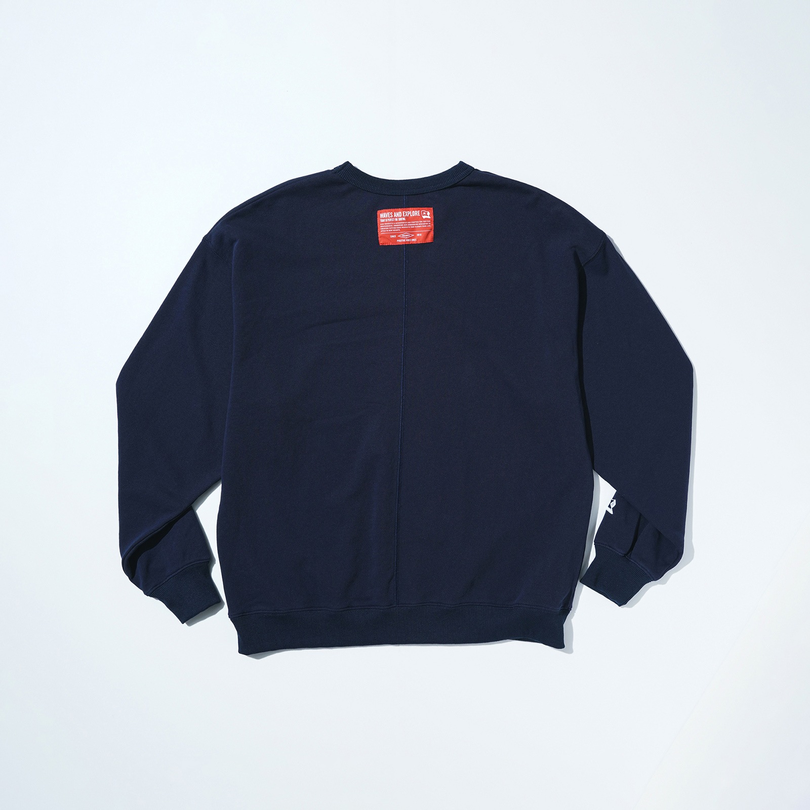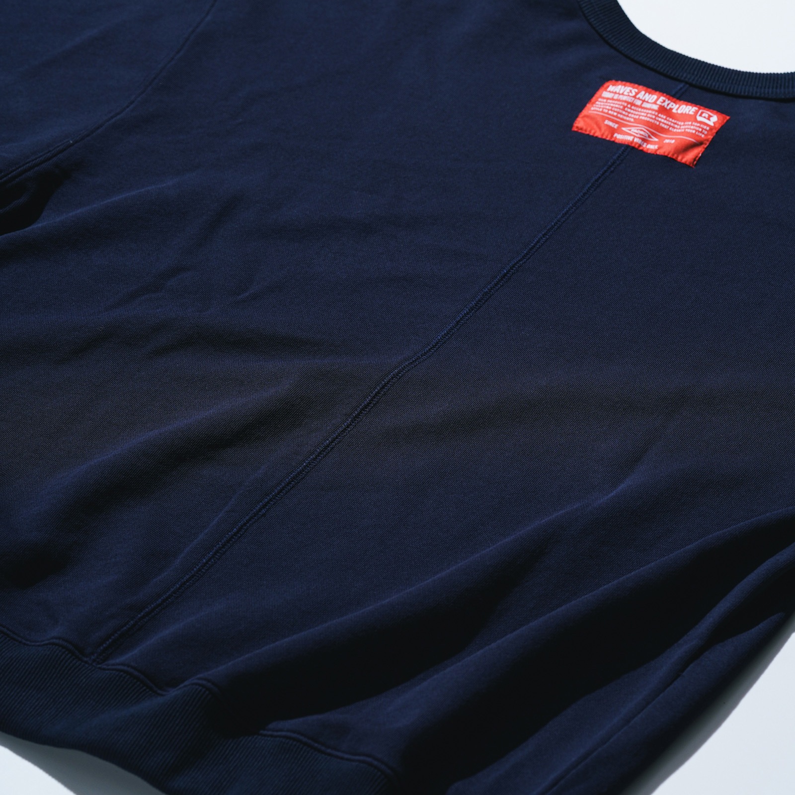 ストーンバイオ加工を施した裏毛のクルーネック。背中のシームステッチと背中のオレンジタグがアクセントになっています。