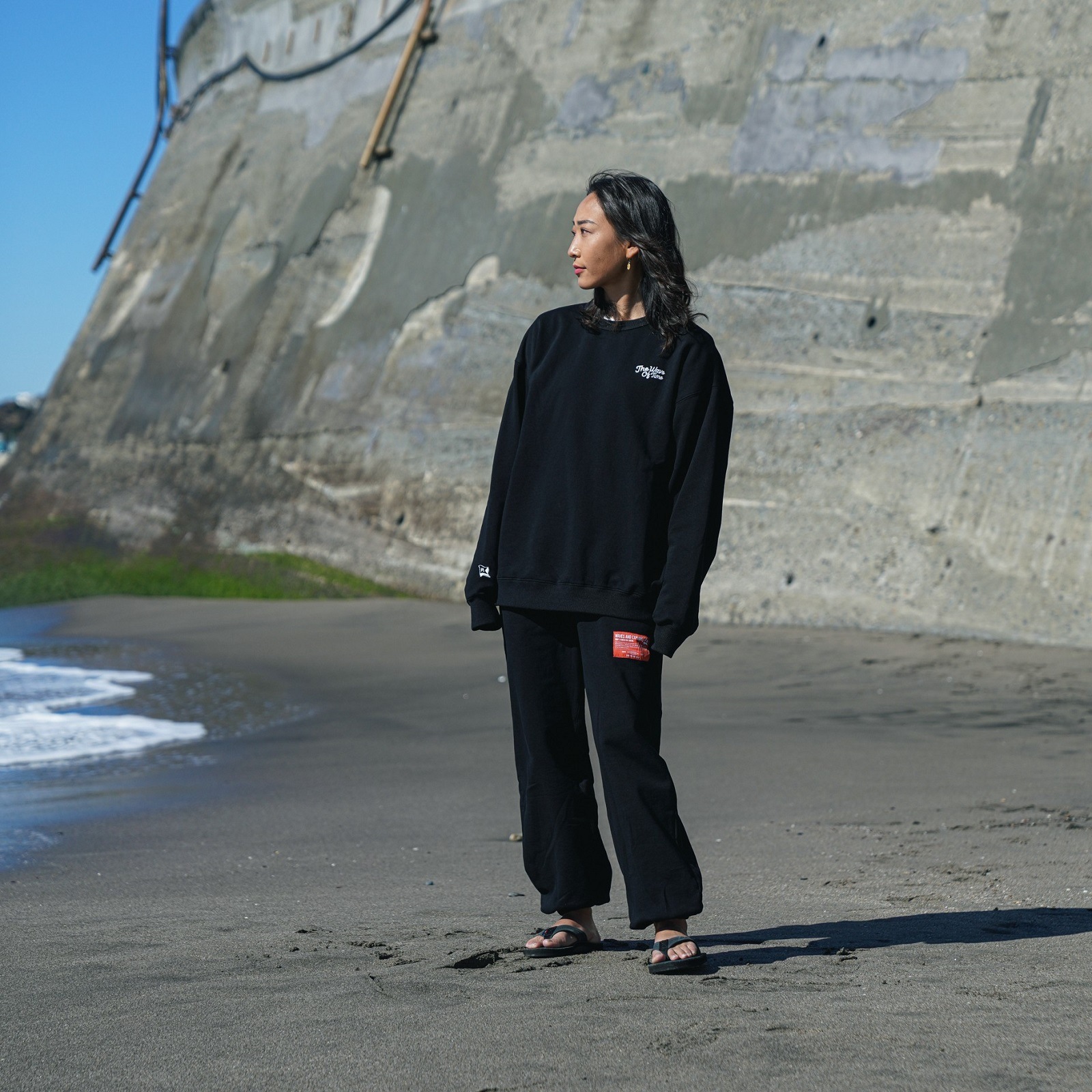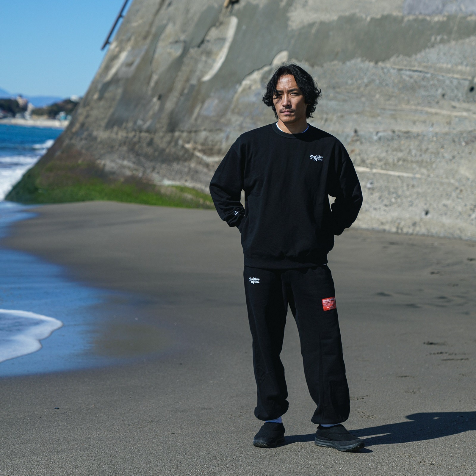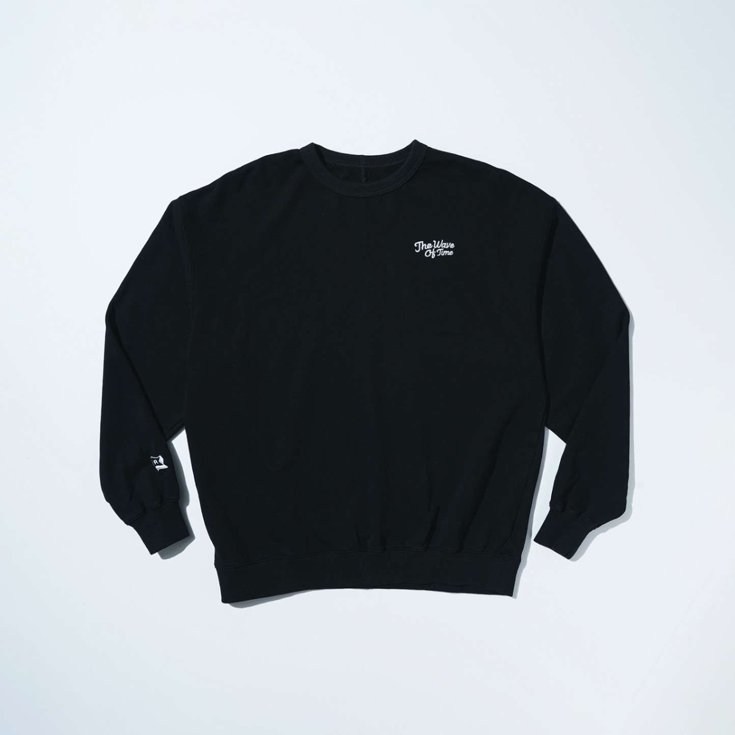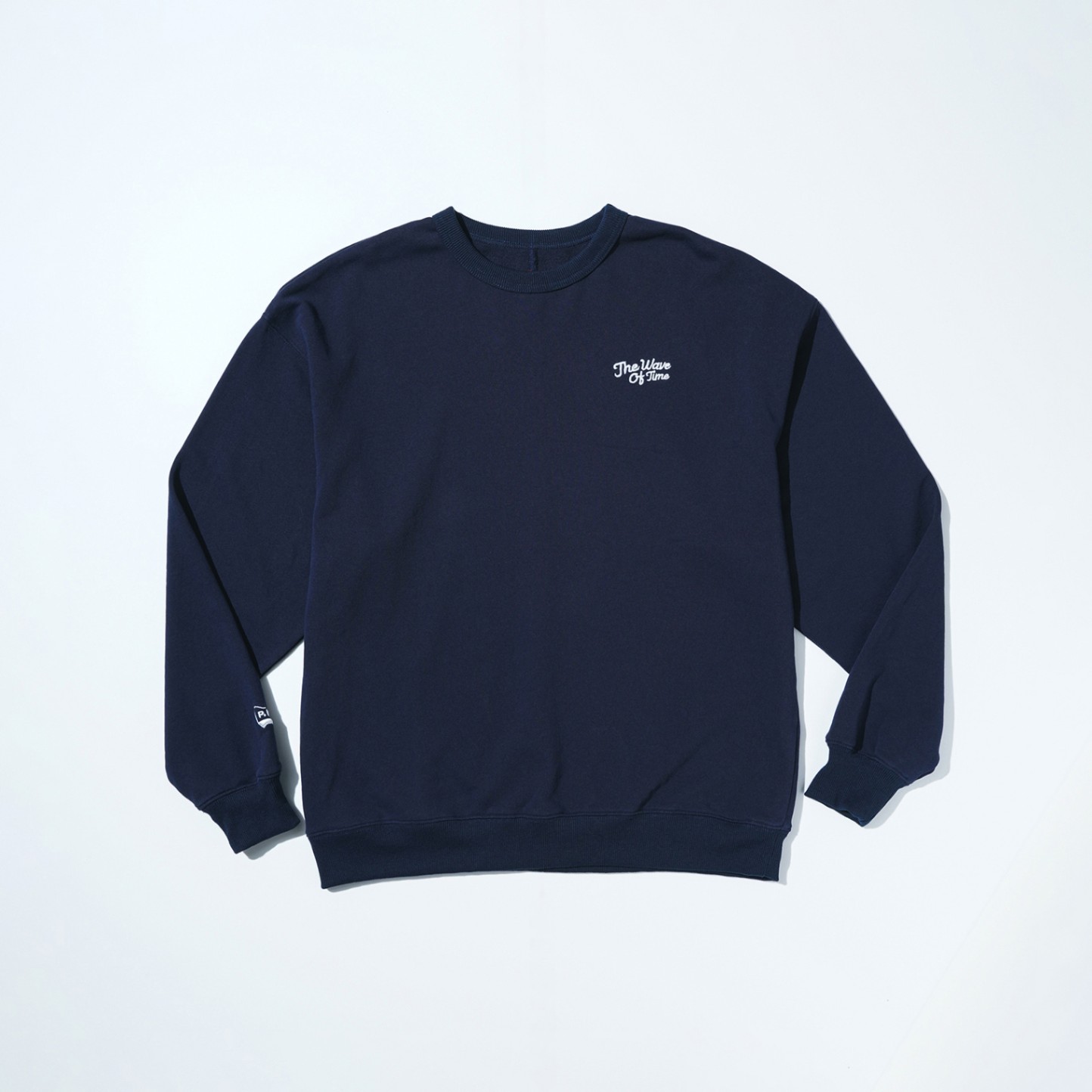 ストーンバイオ加工を施した裏毛のクルーネック。背中のシームステッチと背中のオレンジタグがアクセントになっています。